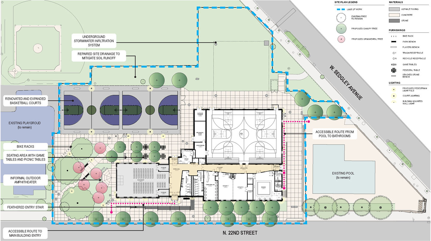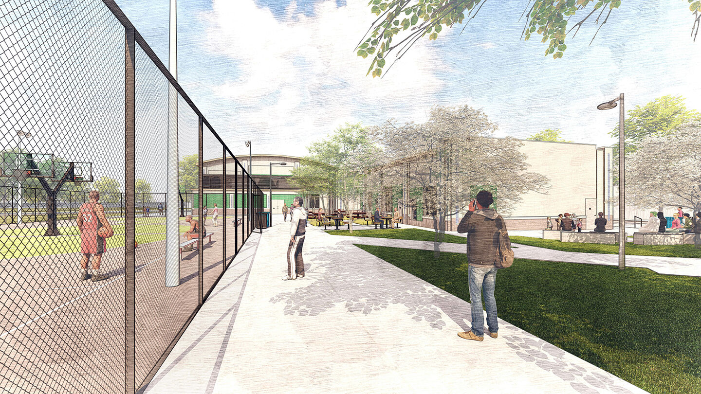 Site work encompasses the refurbishment of basketball courts, a new mini soccer field, landscaping, lawn, shade trees, paved walkways, lighting, seating, and bike racks.