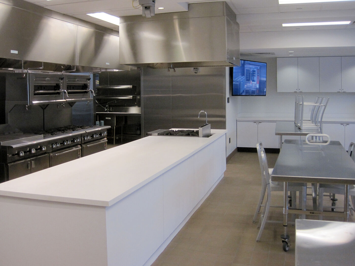 The classroom area seats 36 people at nine high stainless-steel work tables. Three cameras feed to a large-screen TV at the front of the classroom, giving everyone a view to what the instructor is doing. Technological capabilities also include a sound system and the capability to record programming and to stream a live feed.