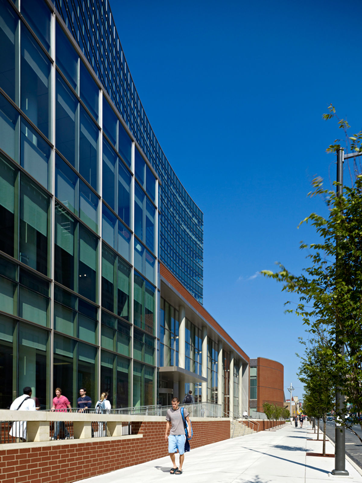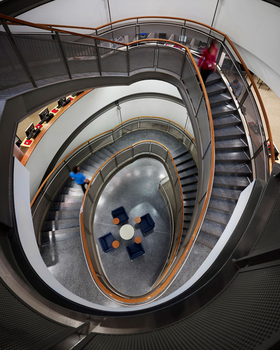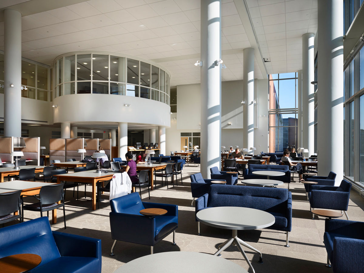 Kelly Maiello was responsible for interior design of the 45,600-square-foot building, which is enclosed by a three-story glass curtainwall. Our approach incorporated various program elements essential to a major academic library: a welcoming public entrance lobby, intuitive digital technology, specialized learning environments tailored to individual and small group learning, administrative offices and support spaces. The common spaces were designed like living rooms to encourage collaborative work and socializing, with furniture conducive to relaxation and/or work. Glass-walled study rooms provide a quieter option.