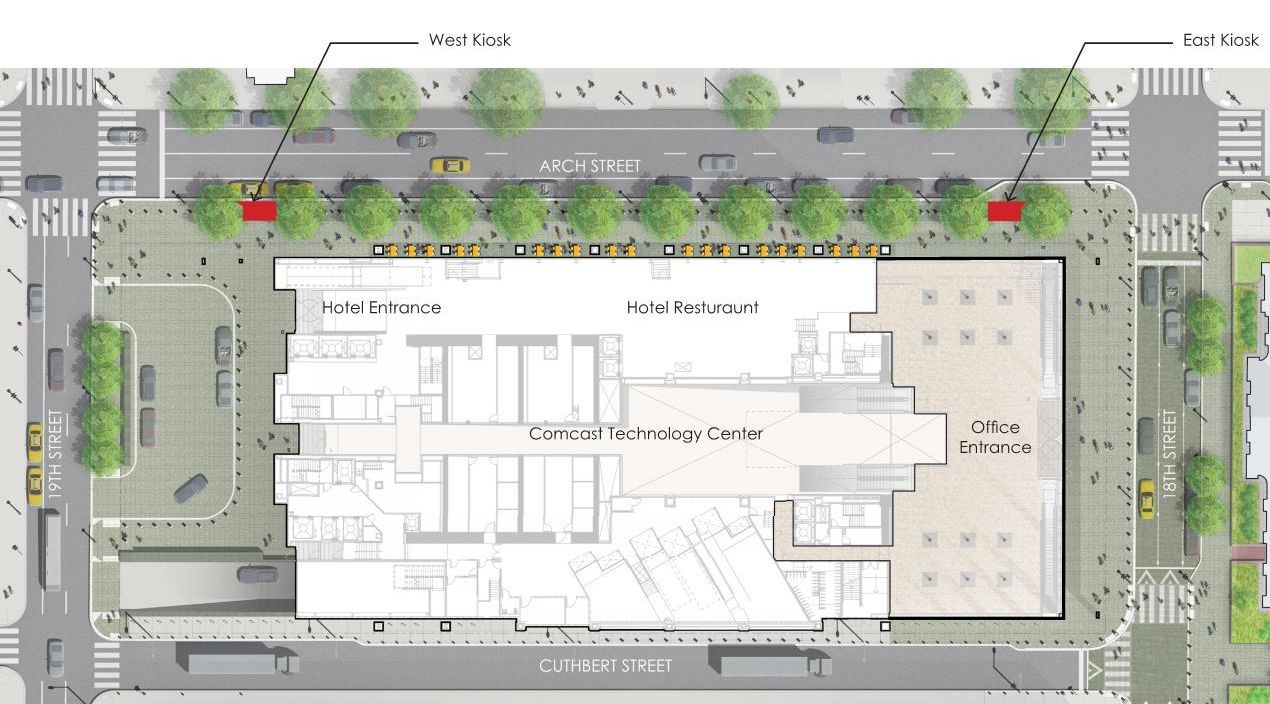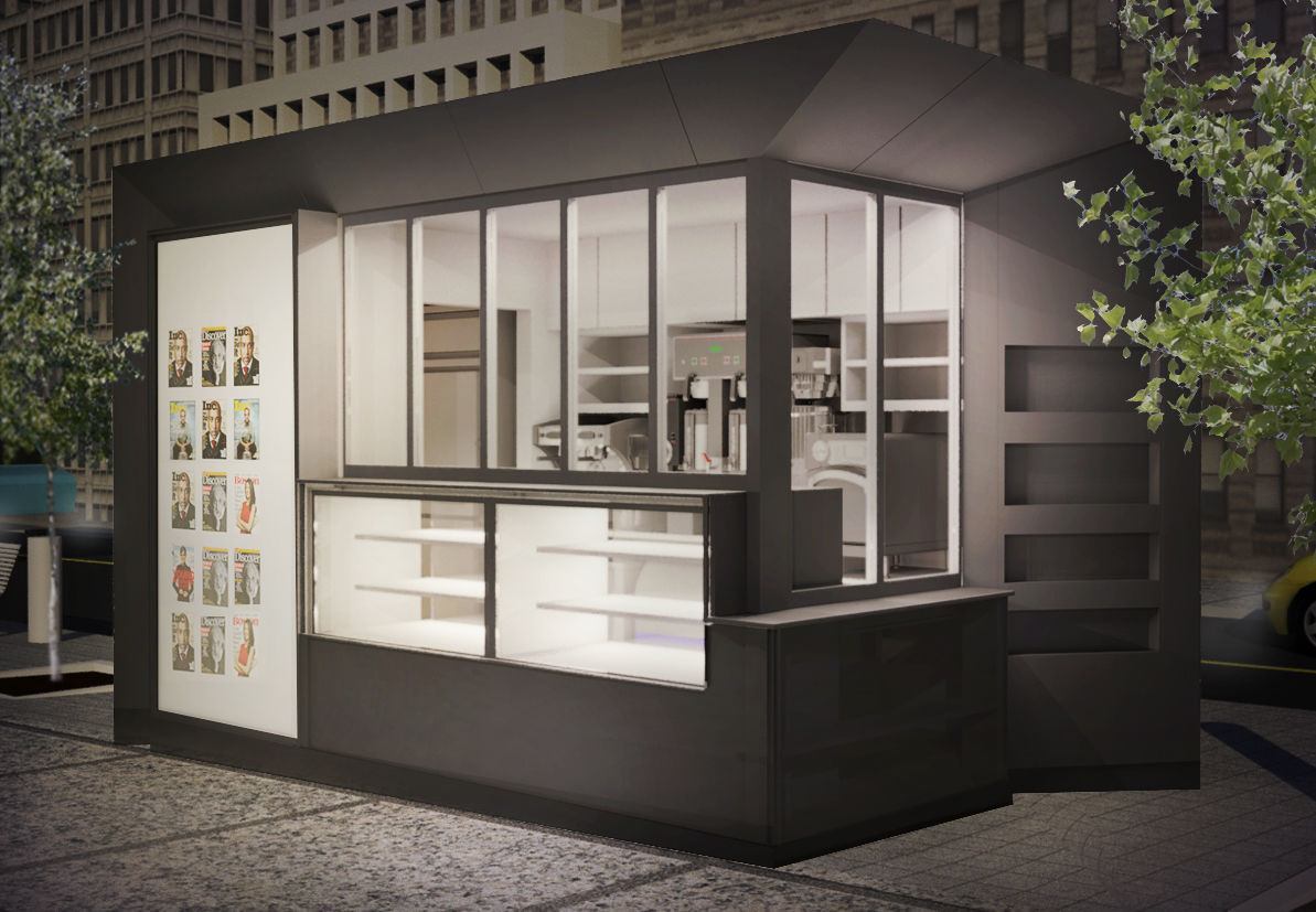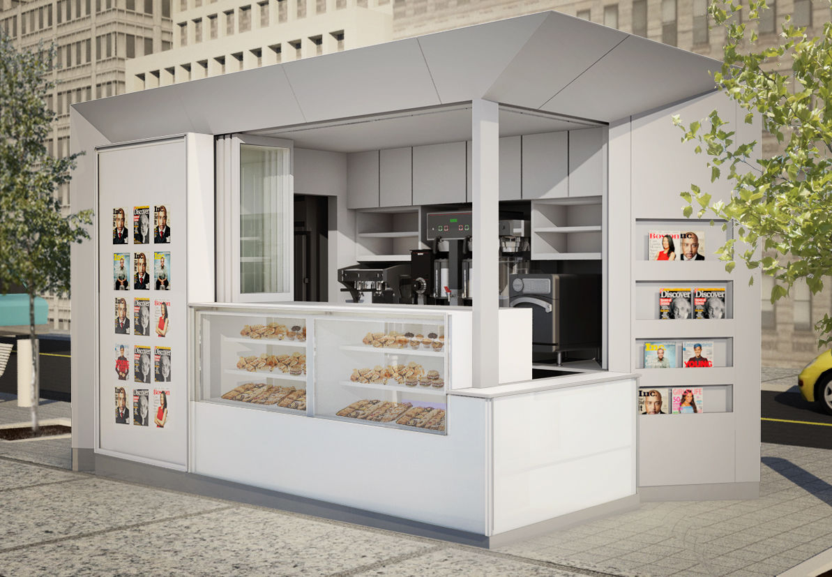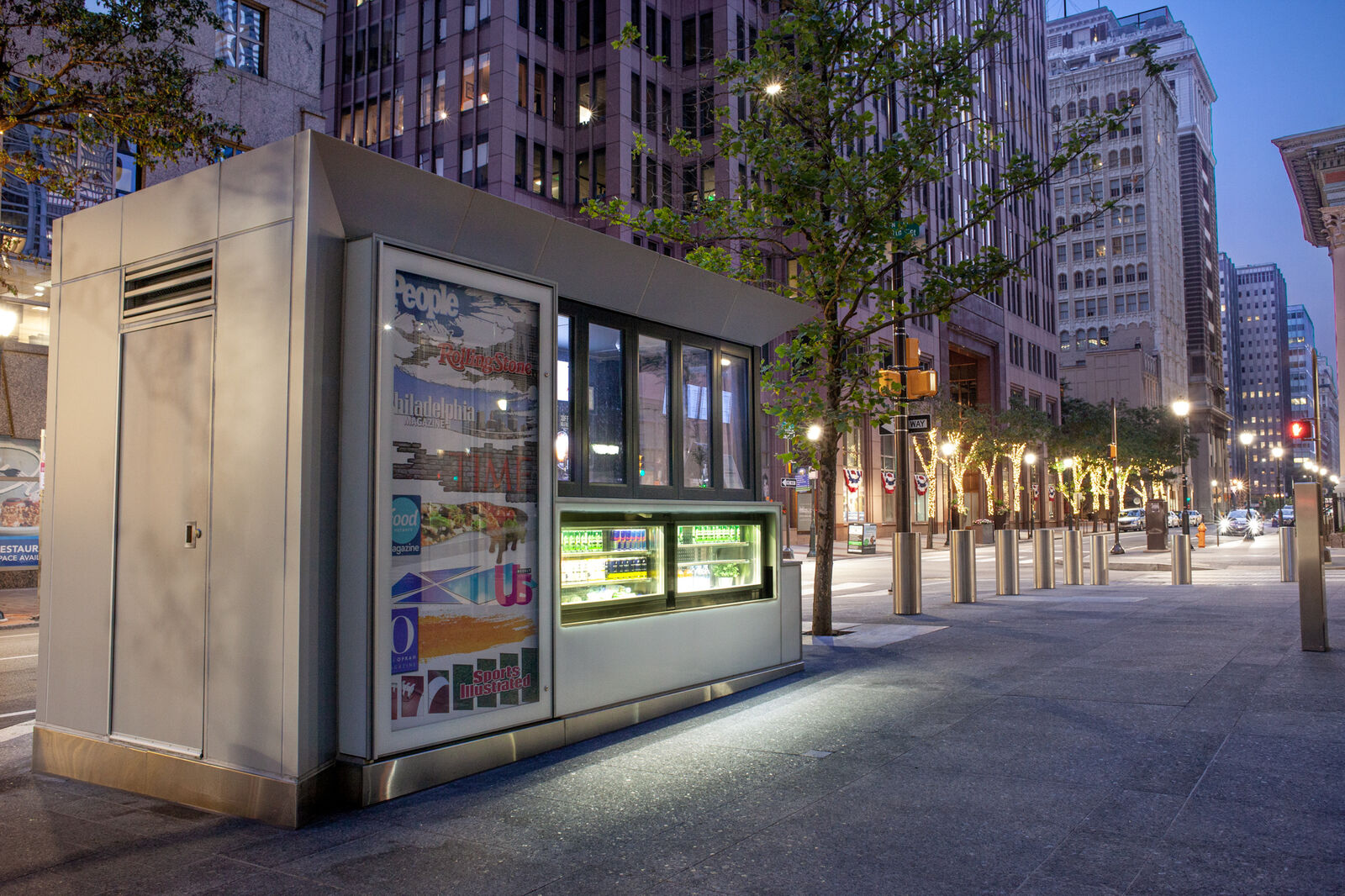 The pair of kiosks were designed by London-based architects Foster & Partners (also responsible for the new Technology Center) as a distinct feature of the new tower. These modern throwback newsstands sell newspapers, magazines, coffee and grab-and-go food items. The designs feature folding glass windows, heating and ventilation that allow for year-round operation to promote activity near the entrances of the tower and establish a positive precedence for future newsstands in the city. The design addressed all building and safety codes, and meets Philadelphia health code requirements.