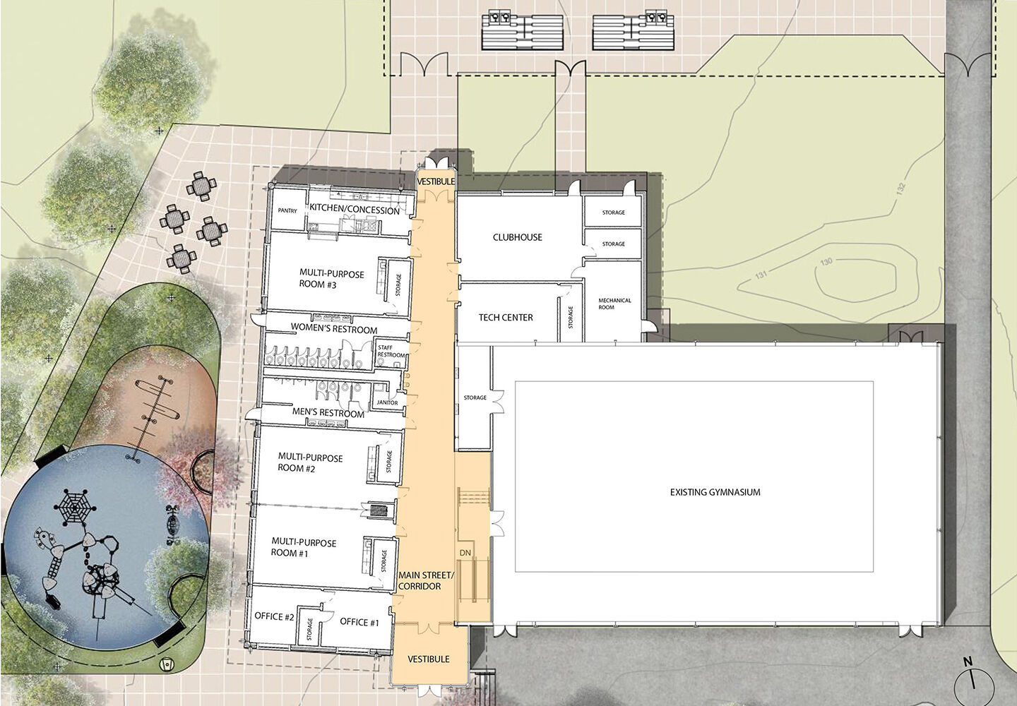 Primary program spaces within the recreation center are positioned to maximize visual access and proximity to the main entrance, community terrace, and playgrounds.