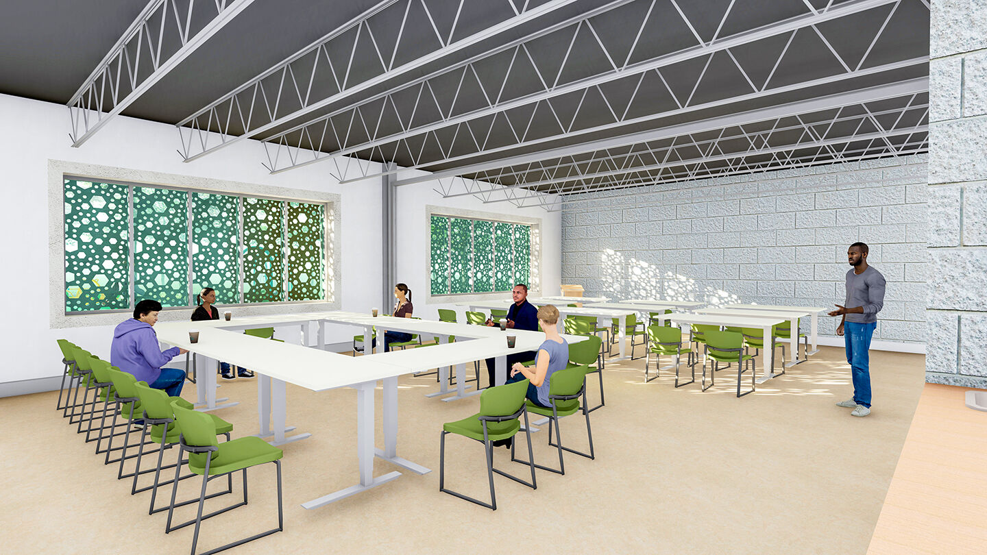 Clerestory glazing and large windows provide ample natural light to the interior “Main Street,” and visibility from the primary program spaces to the outdoor spaces.