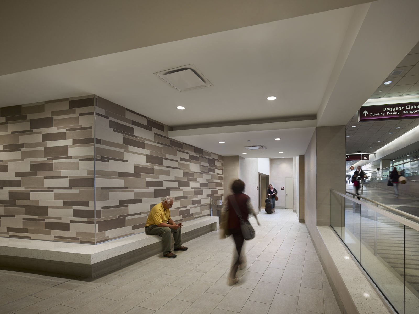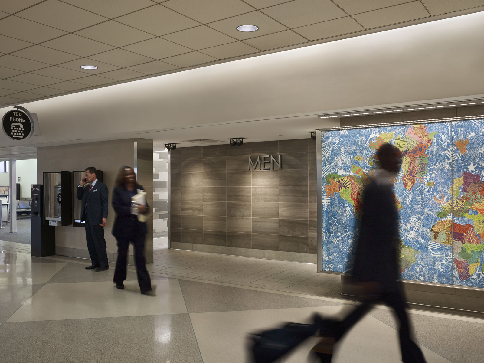 Restrooms in Phases 1 and 2, first renovated about nine years ago, were refreshed. The goal was to make four sets of restrooms in the concourse of Terminals B and C more comfortable and visually appealing to travelers, while increasing energy and water efficiency for facilities that average 7,000 flushes per day. Tasks encompassed planning and design of dynamic new layouts, finishes, and custom millwork.
