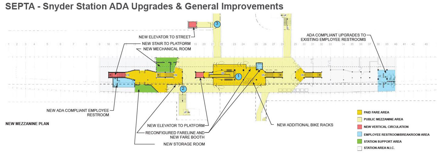 Additional improvements within the station include a new ticket booth and turnstiles, an accessible bathroom for SEPTA employees, bike parking, new porcelain tile floor finish on the platform level, and waterproofing repairs.