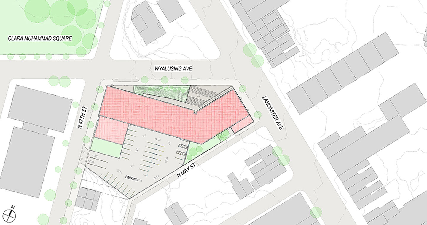 A mix of glass, glazed block, and metal panels will characterize the building’s exterior, with intentional contrast between the lower and upper floors to de-emphasize its mass. The steel and concrete structure will feature a 5,000-square-foot hardscaped rooftop plaza over the commercial space facing Wyalusing Avenue that will be accessible from the second floor. A green roof to support stormwater management is also planned.